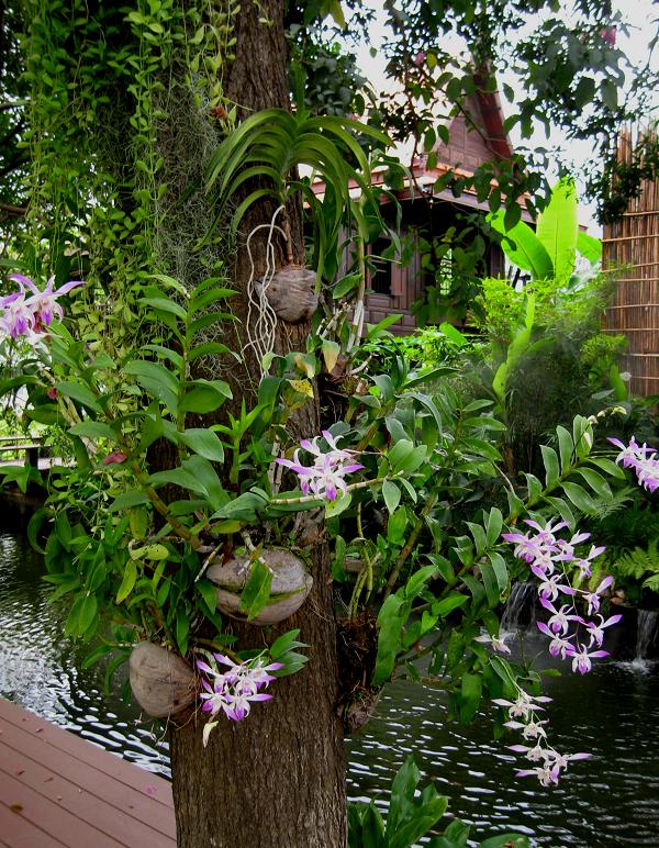 Мы оставили русско-японских слонопотамов и отправились рассматривать сад. Розы нас мало впечатлили – в Сан-Франциско лучше, но орхидеи там прекрасны. Таиландцы пользуются интересной техникой выращивания орхидей: раскалывают пополам кокосовый орех, выскребают сердцевину, подвязывают оставшуюся скорлупу к стволу пальм над водой, и орхидеи растут безо всякого грунта на пальмовых стволах. Нужно только опрыскивать цветы водой по утрам.