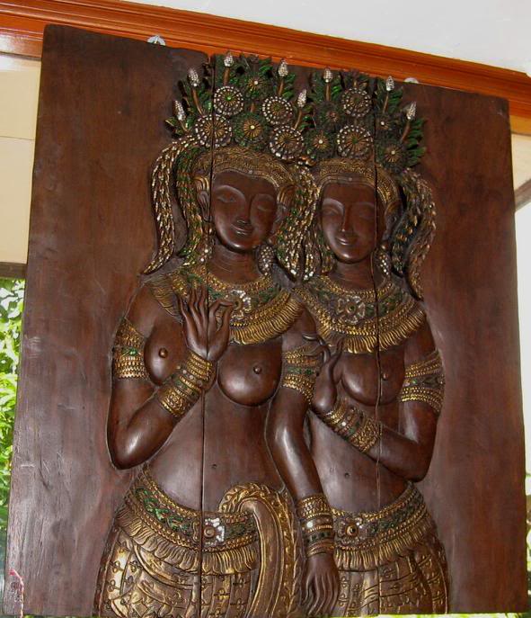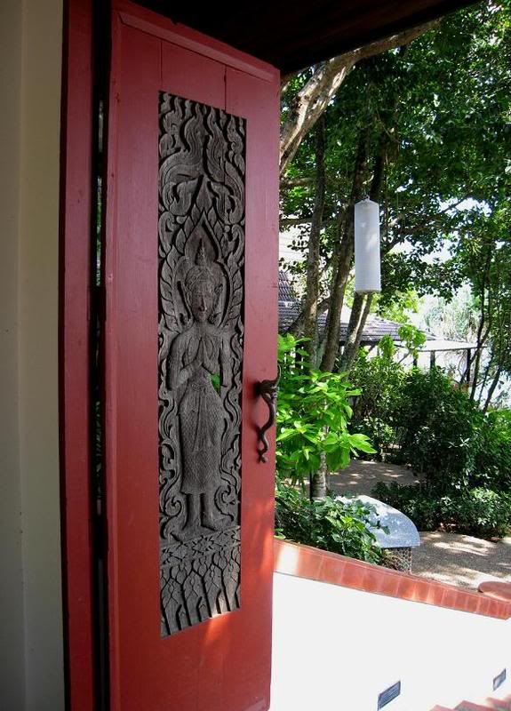 На следующий день мы решили поехать на ланч в Mom Tri’s Kitchen, ресторан, тоже отмеченный как один из лучших на острове. Волшебная резная дверь с изобращением Будды вела из дворика во внутренние пространства Mom Tri’s Villa Royale and Spa.