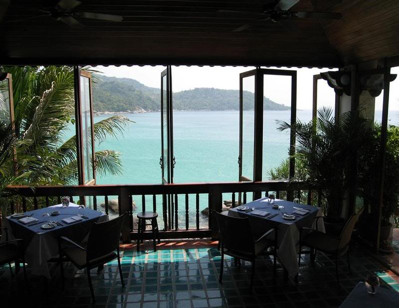 Я позвонил в колокольчик при входе, появились два официанта и проводили нас на веранду, октуда открывался вид на залив, маленький пляж и окрестные горы.