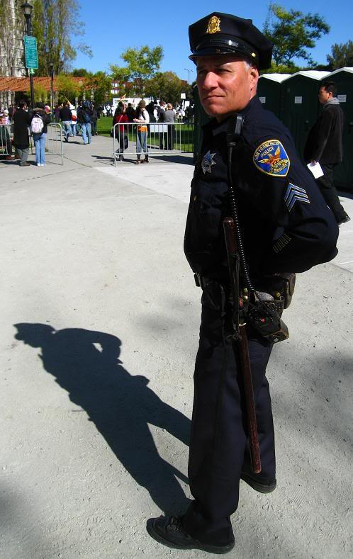 Восточная лужайка Embarcadero была отгорожена полицескими барьерами - именно там накапливались участники нашей демонстрации. Я спросил стоявшего на стрёме полицейского, one of the S.F. finest, ну как, брат, готов к тому, что комми собираются бегать по городу с огнём? Он улыбнулся и сказал, ничего, побегают немного туда-сюда и улетят.