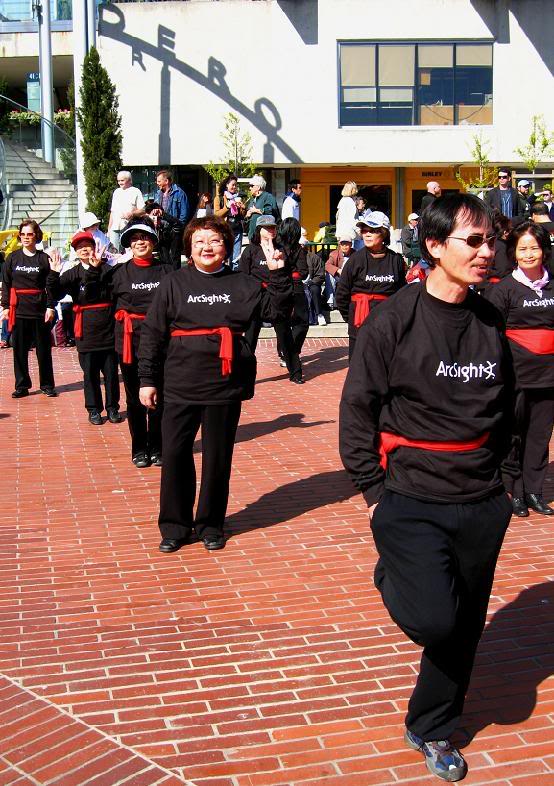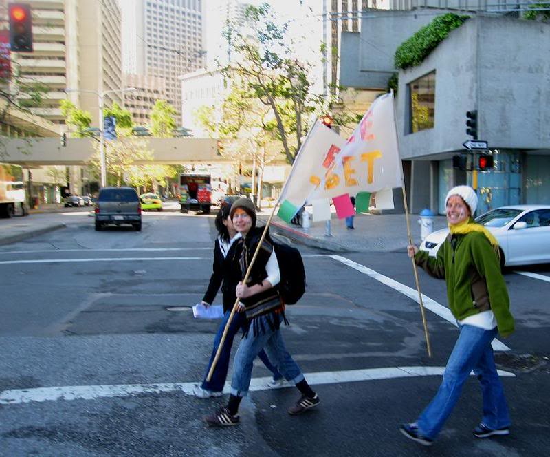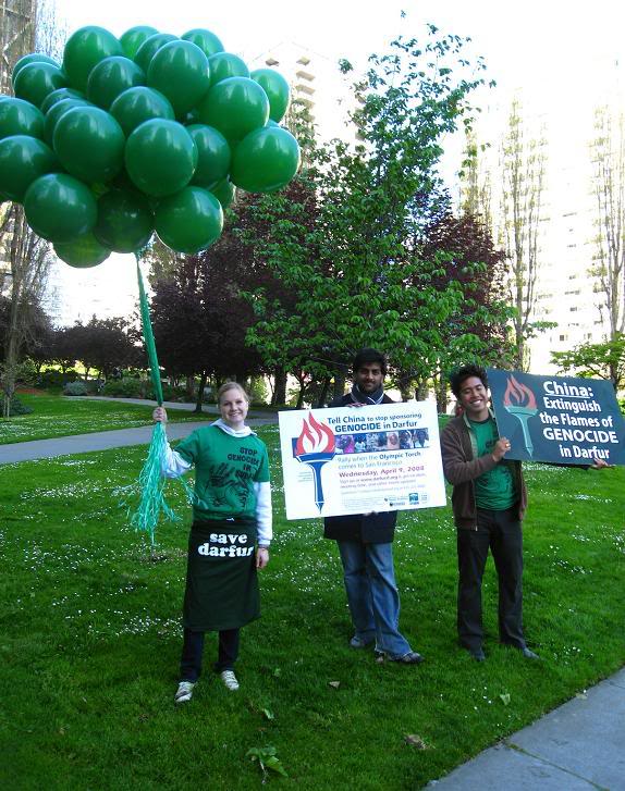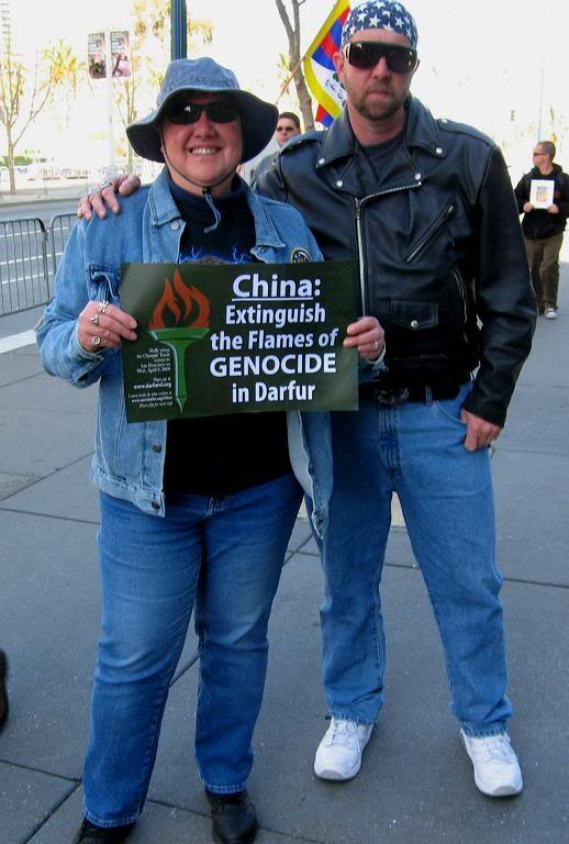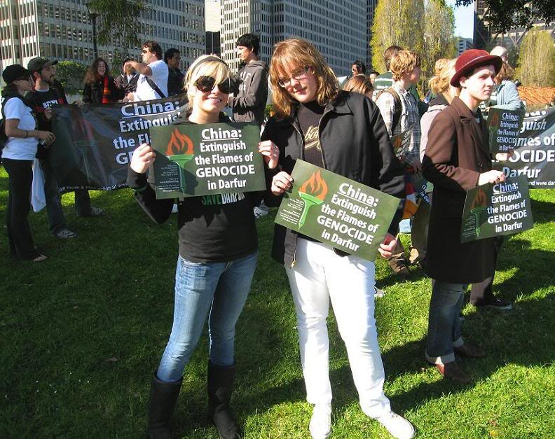 Возле Embarcadero прохожих встречали группы одетых в зелёное христианских групп, протестующих против геноцида христианского населения Дарфура и политики Китая, направленной на поддержку варварского мусульманского правительства Судана. Я взял у них плакатик в защиту населения Дарфура, и вынужден был потом таскаться с ним до конца мероприятия.
