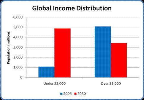 Следующий график показывает, как изменится реальный доход населения планеты при переходе от 2006 к 2050 году. Два левых столбика (синий – 2006 год, красный – 2050 год) показывают, как на планете изменится количество людей с доходом менее $3000 в год. Два правых столбика – как изменится количество людей с доходом свыше $3000 в год.