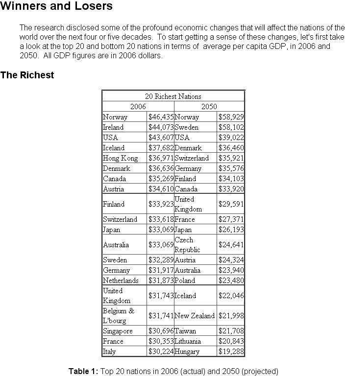 Сейчас я потрачу оставшийся объём отведенного LJ пространства для того, чтобы привести для вашего размышления информацию, касающуюся сравнения данных за 2006 год с научно-предсказанными трендами, определяющими состояние разных стран в 2050 году (графики взяты из исследования Пола Чефурки).