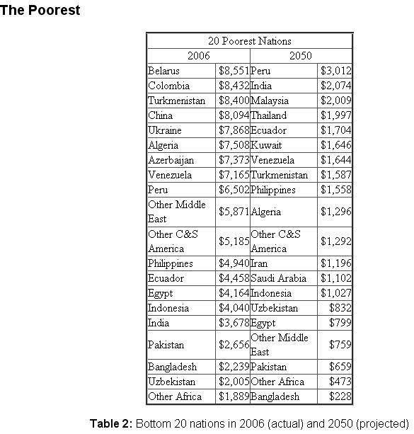 ) indicate that over a billion people today live on a single dollar a day - the total number of people I identified above as comprising the poor of 2006. The growth in that population, coupled with the drop in per capita GDP, implies that several times times that number will be desperately poor in 2050 - perhaps as many as 4 billion. According to the same source, about half the world's population today lives on less than
