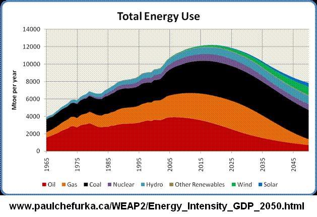 Предполагая, что пик мировой энергодобычи приходится на некий период между 2006 и 2015 годом, и что за прохождением пика последует ежегодно двухпроцентное снижение доступной энергии, ваша медитация послужит разумной моделью для путешествия в будущее, ну, скажем, в год 2050.