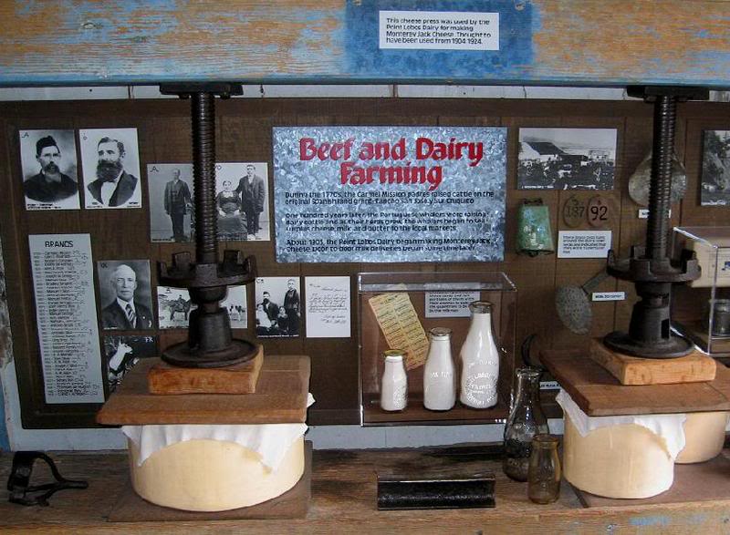 В 1770-х монахи Кармельской Миссии первыми начали выращивать скот на испанских землях Ранчо Сан Хосе и Сур Чикито. Через сто лет семьи португальских китобоев начали откармливать молочных коров, и по мере роста их стад, португальцы стали продавать на сторону излишки молока и масло. Где-то в 1903 году молокозавод Пойнт Лобоса, основанный португальцами, начал изготовлять свой фирменный вид сыра под названием Monterey Jack, доставляя его желающим на дом. На снимке внизу – первые прессы для отжимки монтерейского сыра.