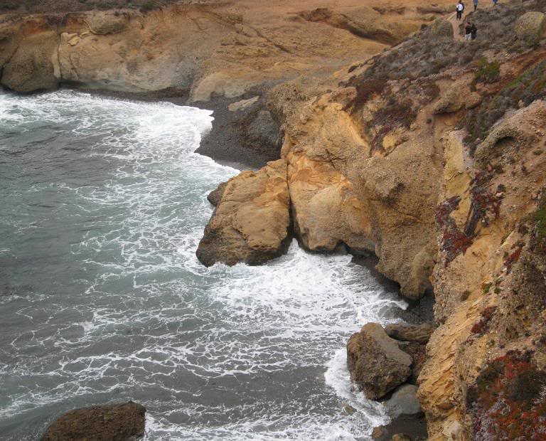я над обрывом, начинали орать в три голоса, оповещая мир о том, что они увидели настоящих калифорнийских тюленей. Остальные туристы опасливо обходили их стороной – кто знает, о чём кричат эти немцы?... Вид вниз с обрыва: