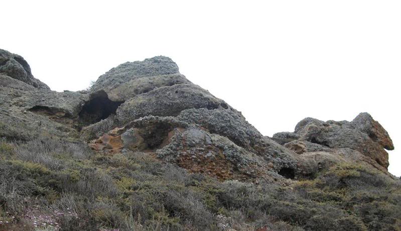 Верхушки мысов сформированы из пористых осадочных пород, покрыты какими-то сероватыми мхами и похожи на сказочных животных: