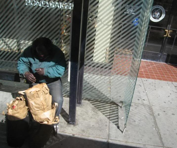 Рядом на троллейбусной остановке перед булочной Honey Bakery ("Guaranteed To Be Simply The Best") обосновался бездомный. Хозяин булочной выдал ему кульки со вчерашними булочками, вот он сидит в ожидании транспорта и размышляет, как доставить улов своим друганам