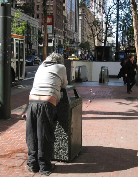 На следующем фото, возможно, один из его партнёров по бизнесу. Этот товарищ обосновался с удобством на мусорной урне у выхода из метро (по-нашему, называется BART - Bay Area Rapid Transit), повидимому, оценив, что здесь должны хорошо подавать человеку, у которого от голода штаны с жопы сползают.
