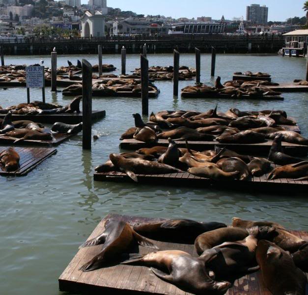 На заливе полным-полно тюленей, которым удалось выжить рыбачков с 39-го пирса. Эти морские животные пользуются охраной закона, чтобы целый день валяться на плавучих понтонах, у которым раньше стояли рыбацкие катера. Они страшно орут и дерутся за лучшее место под солнцем. Хорошая жизнь у сан-францисских тюленей!