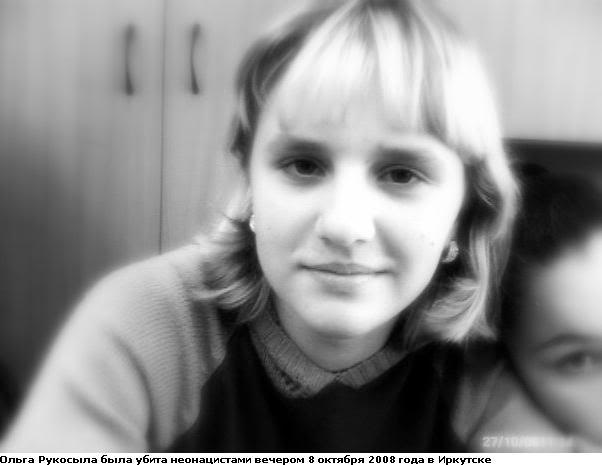 "В Иркутске нацисты совершили еще одно убийство8 октября 2008 года около 22 часов в Иркутске в районе Синюшина гора была убита 16-летняя Ольга Рукосыла. Как рассказывают очевидцы, к ней подошли трое молодых людей, одетых по наци-скинхед моде, задали какой-то вопрос, дернули за руку. В ответ Ольга что-то резко ответила. После этого ее повалили на землю и в течение нескольких минут избивали ногами. Прохожие вызвали "скорую", которая отвезла девушку в больницу, но в ту же ночь она скончалась.