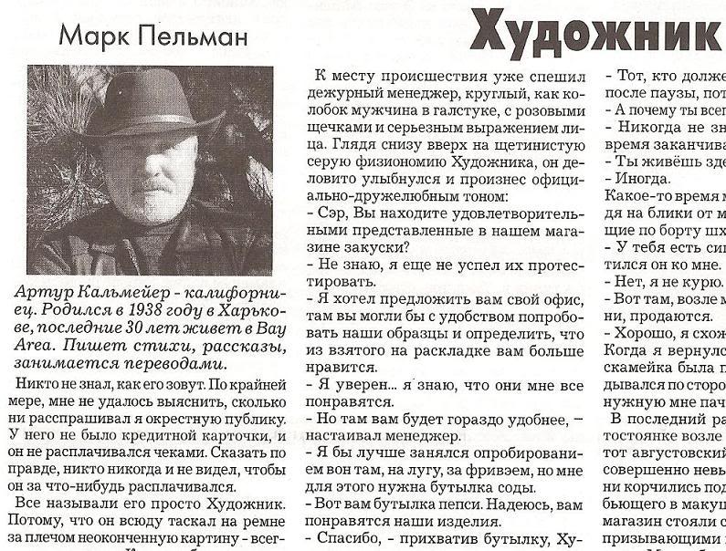 Вот и на этой неделе...Выход ящая в Сан-Франциско газета Русская Жизнь время от времени публикует мои рассказы. Открываю вчера очередной выпуск газеты и вижу свой рассказ «Художник» на развороте. А в качестве автора указан Марк Пельман. Я с Марком Пельманом не знаком. Но, судя по фотографии, он чертовски похож на меня!
