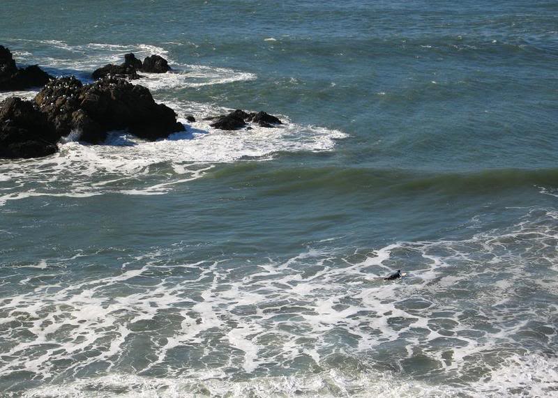 Сан-Франциско, одинокий сёрфер возле скал Cliff House.