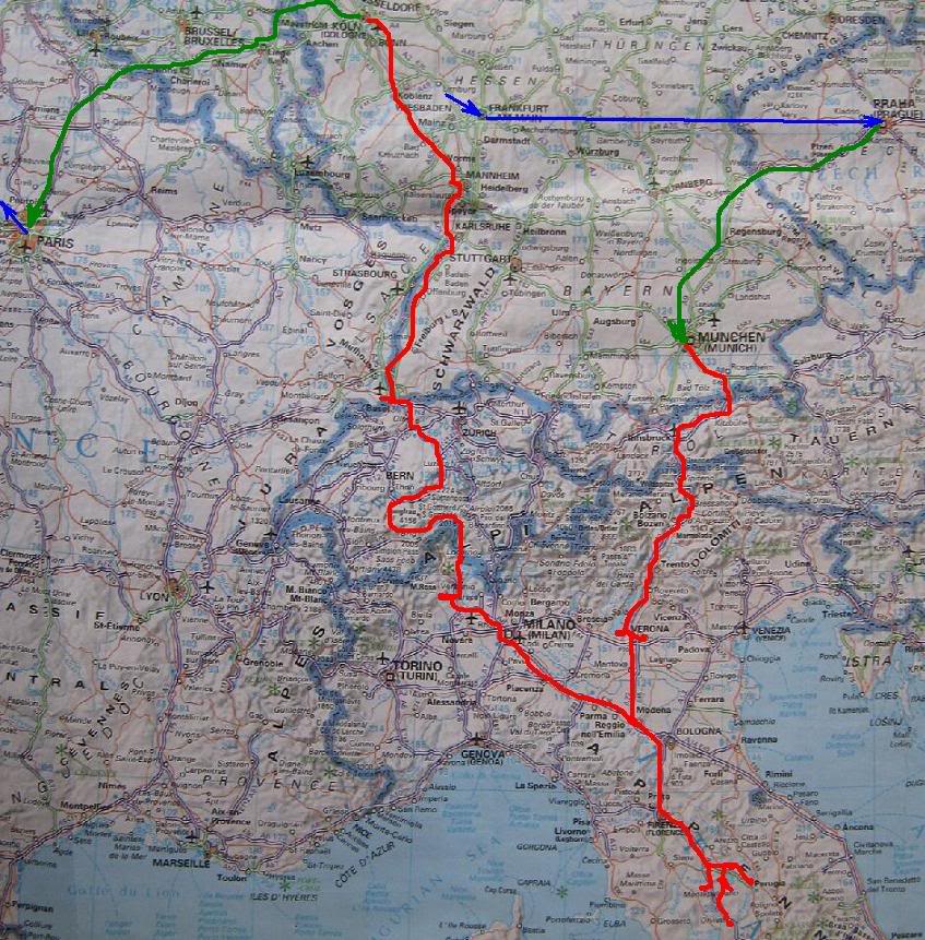 Решено было лететь из Франкфурта в Прагу, из Праги в Мюнхен ехать поездом, в Мюнхене брать напрокат автомобиль и ехать на нём – через Австрию – в Италию, из Италии – через Швейцарию – в Германию, в Кёльн. В Кёльне сдать автомобиль, приехать на поезде в Париж, и оттуда уже лететь домой в Калифорнию.