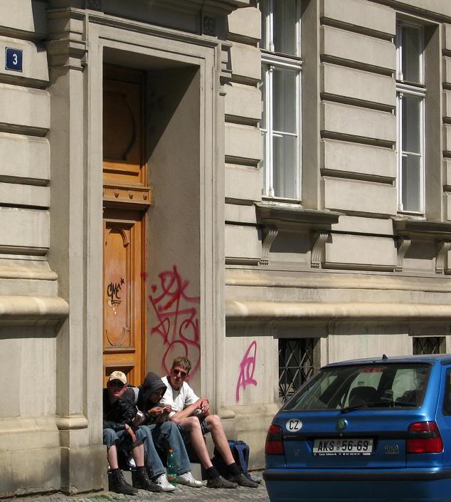 ... троица молодых панков, проводящих досуг в только что размалёванном ими подъезде дома в Новом Месте. Эти поглядывают на меня настороженно – я начал доставать фотоаппарат ещё когда они расписывали стену – кто знает, чего можно ожидать от этих старичков с фотоаппаратами