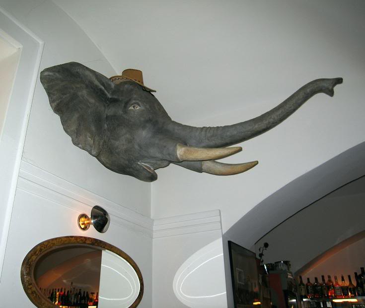 ”Universal”. В баре этого ресторана посетителя встречает висящая на стене голова слона в шляпе (надо полагать, чешский вариант коня в пальто...)