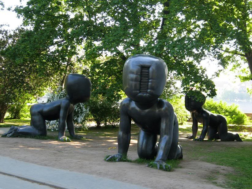 Тема эта получила неожиданное развитие и в ультрамодерной скульптурной группе гигантских чёрных ползунков-мутантов, поселившихся в садике