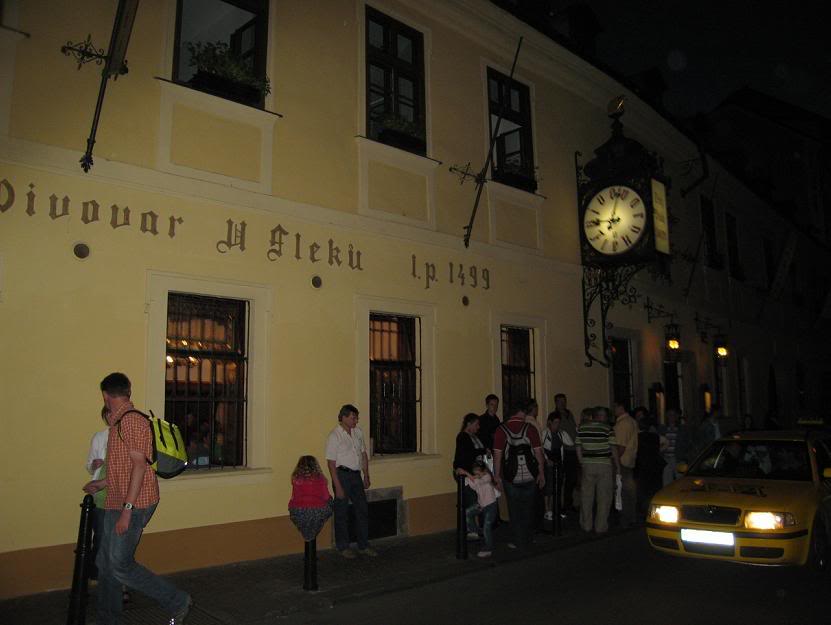 . Поэтому ни к чему спрашивать у посетителя, зачем он пришёл: сюда приходят пить чёрное пиво. Еду тоже можно заказать, но не ожидайте деликатесов. Еда простая, грубая, наверное, та же самая, какую подавали У Флека пятьсот лет назад: гуляш, свиная отбивная с тушёной капустой, ромштекс, ну, в общем, вы поняли. Большинство посетителей приходит только за пивом.