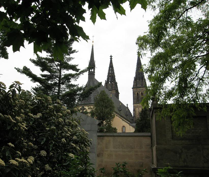 Мы с Тоней попали туда в пасмурный, холодный день 6 мая. Долго подымались по серпантину лестниц со стороны Влтавы, наконец выперлись высоко на гору. За крепостной стеной виднелись башни костёла. Здесь царит тишина – шум города остался далеко внизу.