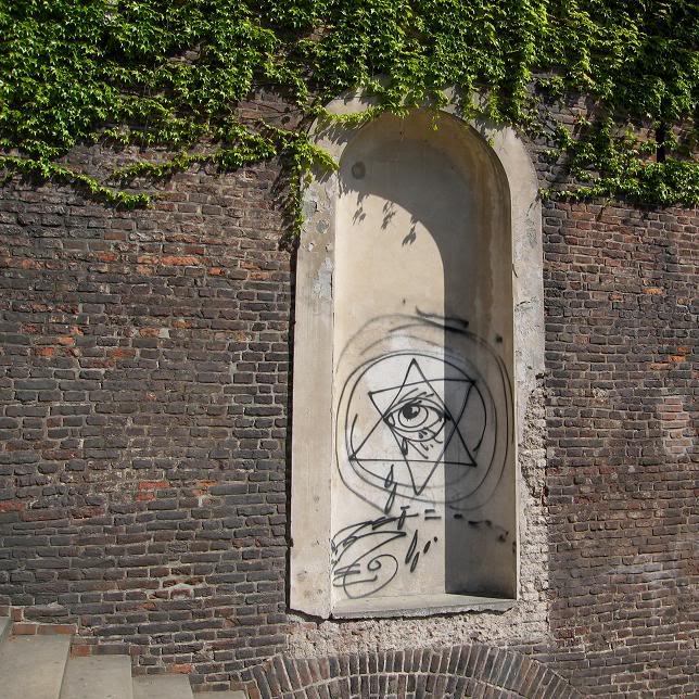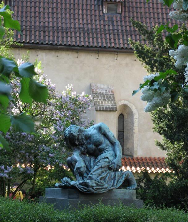 А в нише на подпорной стене улицы Zamecke Shody (Замковая Лестница), на подходе к Пражскому Замку, я обнаружил вполне современный сюжет, который каждый из вас может расшифровывать по своему разумению:
