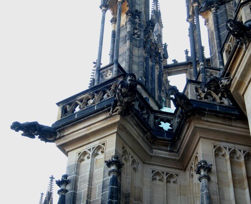 Внутри замковой ограды – два восхитительных храма: огромный готический Собор Св. Витуса и, чуть поменьше размером, Базилика Св. Георга – романского стиля. Кроме соборов здесь полным-полно музеев, дворцов, галлерей, садов, кафешек, узких улочек, площадей и коттеджей Златой Улички. Снимать соборы с близкого расстояния – неблагодарная задача, они отказываются лезть в объектив. Вместо этого я сделал несколько снимков весьма симпатичных горгулей.
