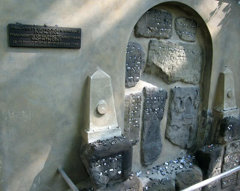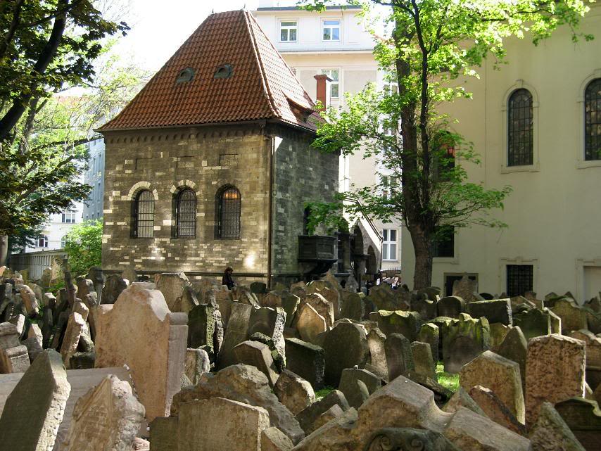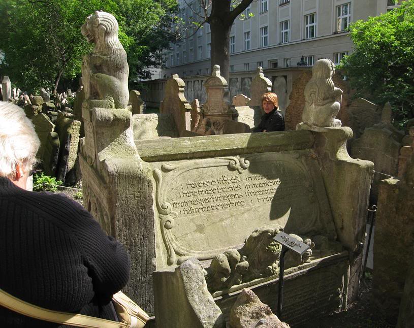Сразу за Пинкусовой Синагогой – Stary Zidovsky Hrbitov – старое еврейское кладбище. В тесноте, на крохотном клочке земли собралось невероятное количество надгробных плит – более двенадцати тысяч. Дело в том, что в 1493 году евреям было запрещено хоронить своих мёртвых вне еврейского гетто, и вплоть до эдикта Йозефа Второго об эмансипации всех умерших приходилось хоронить на этом кусочке земли. Могилы использовались многократно, иногда по 10-12 раз приходилось хоронить людей в одной и той же могиле. Надгробья накапливались, так что в конце концов надгробные камни просто стояли один рядом с другим. На многих надгробных плитах изображены звери. Лиса (fox) обозначает, что умерший принадлежал к семейству Fuchs’ов, мышь – символ семейства Meisel. Сложенные молитвенно руки означает, что покойный принадлежал к жреческому роду Коэнов. Одна из наиболее посещаемых – могила Rabbi Loew (1520 – 1609), знаменитого создателя Голема. Выполненное в барочном стиле надгробие украшено львом и гроздью винограда.