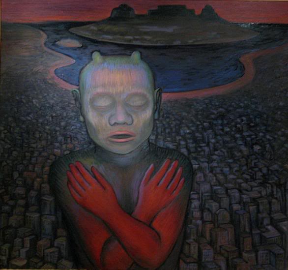 На заднем фасаде синагоги – вход в галлерею Роберта Гутмана, в которой во время нашего посещения были выставлены картины и скульптуры Ярослава Рона. Мне приглянулись две его работы. Первая изображает... ммм... некое симпатичное и очень грустное существо с рожками, заброшенное судьбой-злодейкой в совершенно не приспособленны й для выживания пейзаж