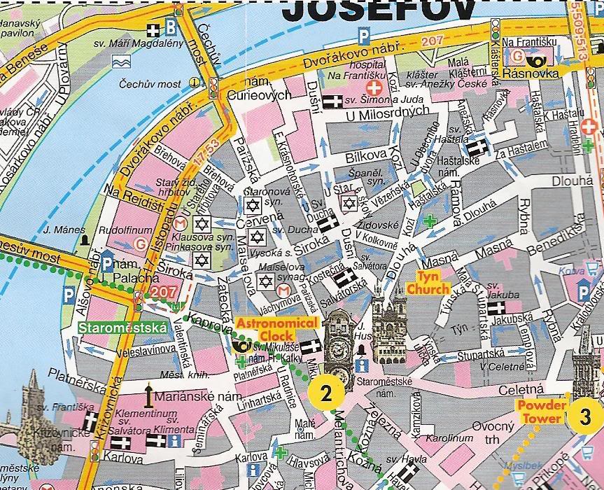 Я читал до поездки об этом районе Праги и решил непременно с ним познакомиться. До Второй Мировой войны здесь обитала одна из самых влиятельных еврейских общин Европы. На карте Йозефов представляет собой компактный сектор на северо-западе Старого Места, неподалеку от изгиба Влтавы. Названия и расположение синагог ясно видны на карте.