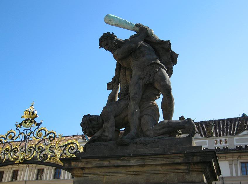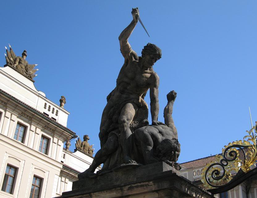У входа в замок тусовалась огромная толпа туристов, не последнюю роль в которой играли россияне. Вход в Замок охраняется оградой с двумя скульптурными группами вполне кровожадного свойства: