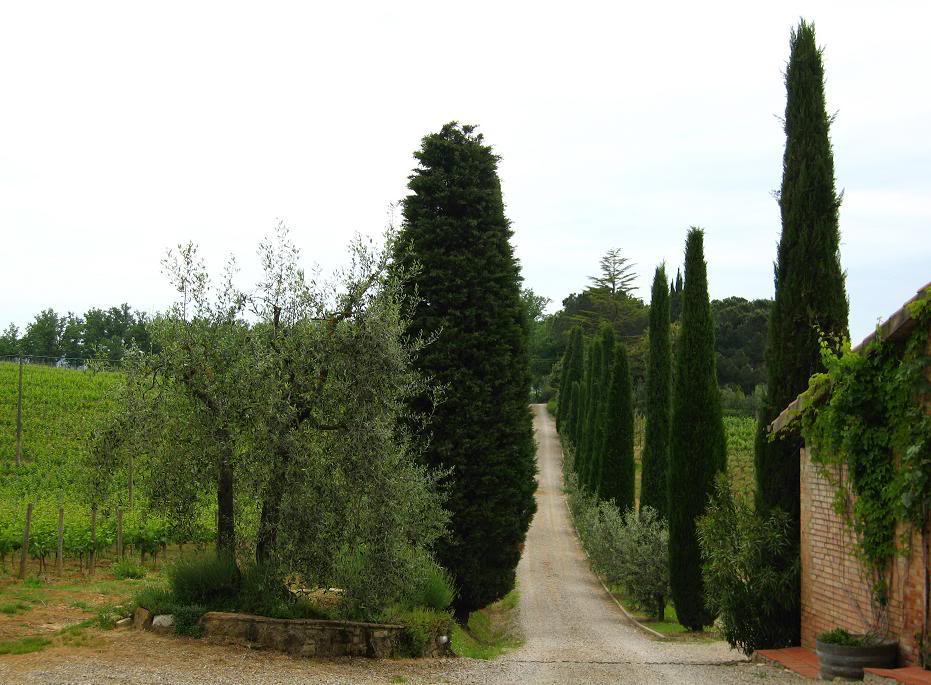 “Poliziano”, наконец, покатавшись туда-обратно, мы всё-таки нашли дорогу к винодельне, усаженную рядами стройных кипарисов: красные здания, окружённые бесконечными виноградниками, склады, силуэт маслодавилки..