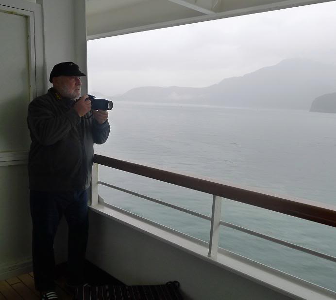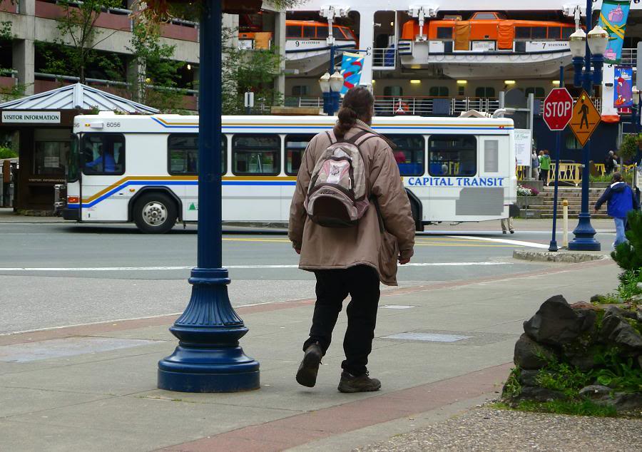 Одна из самых удачных, на мой взгляд, самых символических фотографий, которые мне удалось сделать в этом путешествии, снята на пустынной улочке Джюно: современный человек, пристёгнутый к своему мобильнику, идёт, уставив взгляд в асфальт, не замечая, что за ним наблюдают настоящие Обитатели Аляски: