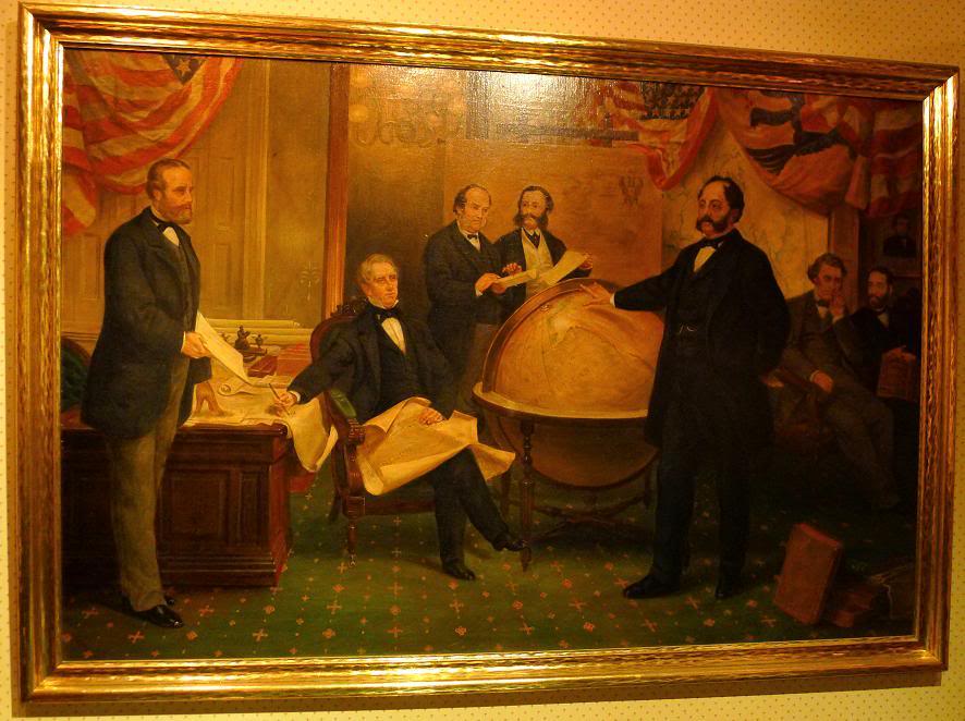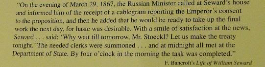 30 марта 1867 года Сюард завершил переговоры с русским послом о покупке 586,412 квадратных миль территории Аляски (1,518,800 км² - территория вдвое превосходившая размер самого большого штата, Техаса) за круглую сумму в $7,200,000. Это составляет около двух центов за акр (стоимость акра земли в Аляске в 2005 году составляла 95 миллионов долларов). За десять лет до покупки Аляски, в 1857 году в
