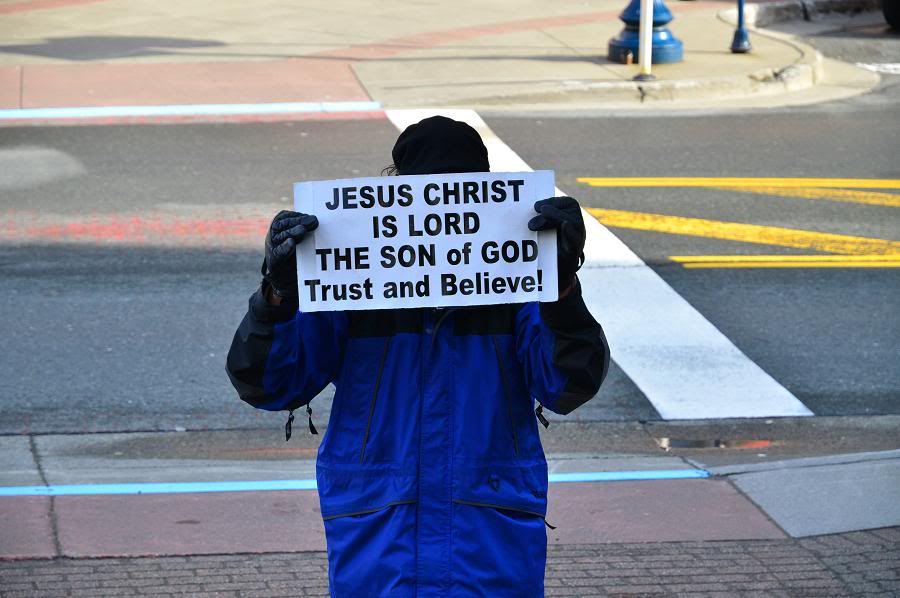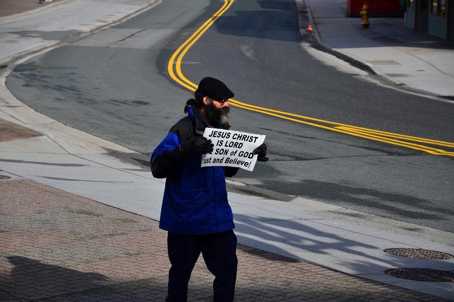 Увидев, что я его снимаю, мужичок стал как вкопанный, заслонив лицо своим своим плакатом. Публика не обращала на него ни малейшего внимания, может быть потому, что он не призносил ни слова. Когда-то на площади столицы Коста-Рики я видел тамошнего христового энтузиаста, тот выкрикивал цитаты из затрёпанной книжицы Нового Завета, грозил пальцем потенциальным грешникам и вообще вёл себя гораздо оживлённее, так что публика садилась на садовые скамейки послушать пламенную проповедь. У адептов одной и той же религии совсем разные темпераменты вблизи экватора и на крайнем севере!...