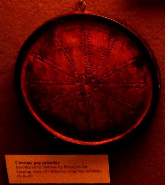 Прошу прощения за качество следующего снимка: в этом месте зала было совсем темно, а пользоваться вспышкой там не разрешают. На снимке – интересное приспособление, изобретенное русскими священниками для обучения индейцев календарю православных праздников. Не знаю, как именно работает этот