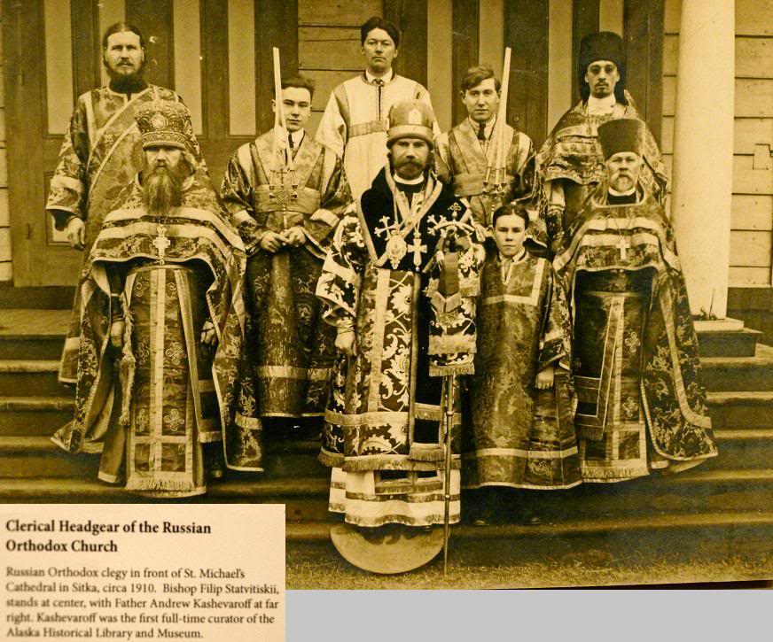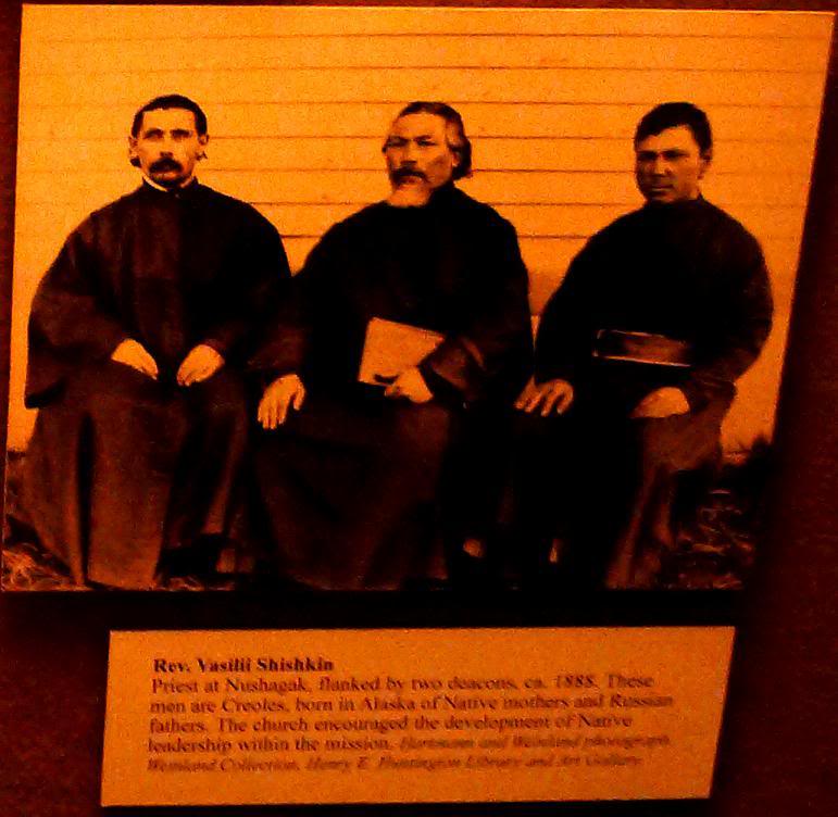Русские колонисты направляли значительные усилия на обращение индейских племён в православие. Обращение шло тем более успешно, чем больше русских женились на женщинах из береговых индейских племён. На снимке ниже – преподобный отец Василий Шишкин с двумя диаконами, все трое – метисы от подобных смешанных браков.