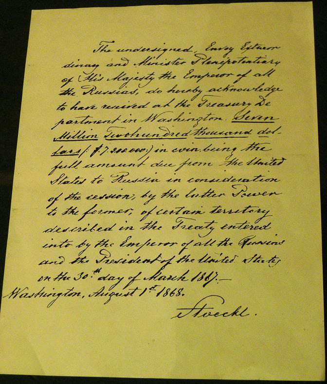 Ниже ксерокопия чека, выписанного Александру Второму за Аляску: