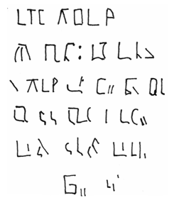 22 сентября 2012 года на сайте «Академии Тринитаризма» было опубликовано письмо Артема Борисовича Каракаева с просьбой сказать, что и на каком языке написано на камне, фотография которого приводится на рис.1. Камень этот, по словам Артема Борисовича, найден в лесу неподалеку от д. Урицкое, что находится в 30-35 км от гор. Великие Луки. Неподалеку от места находки протекает река Ловать, по которой, как говорят летописные источники, проходил путь из Варяг в Греки (1).
