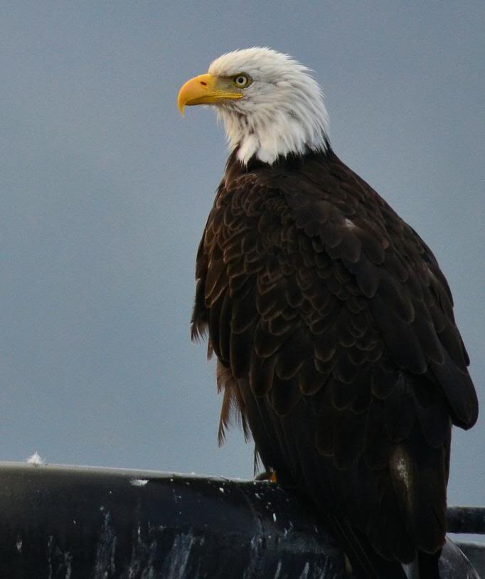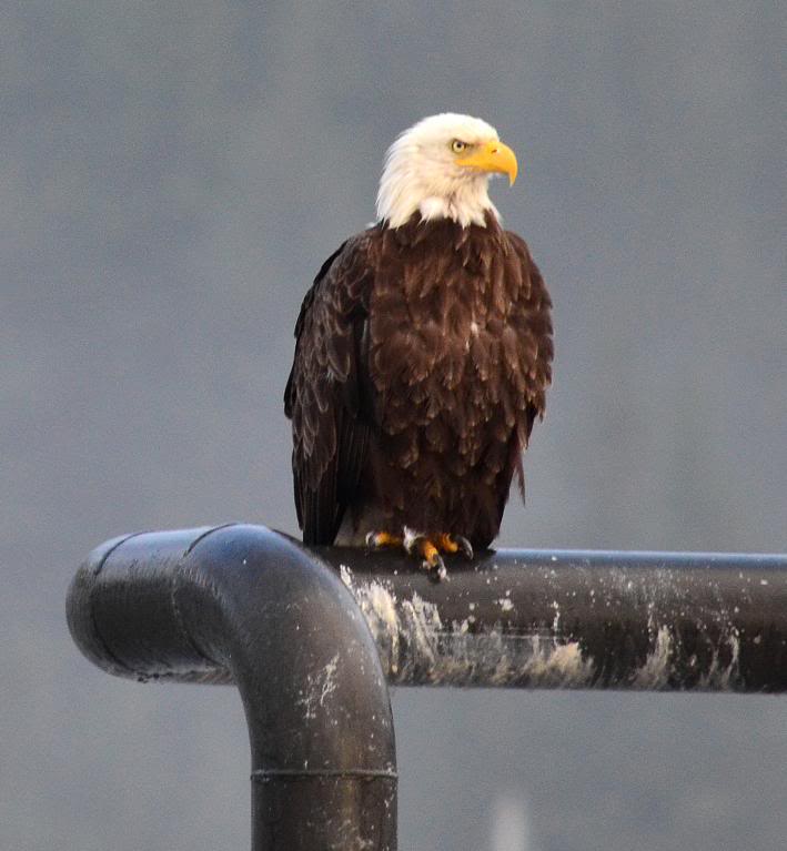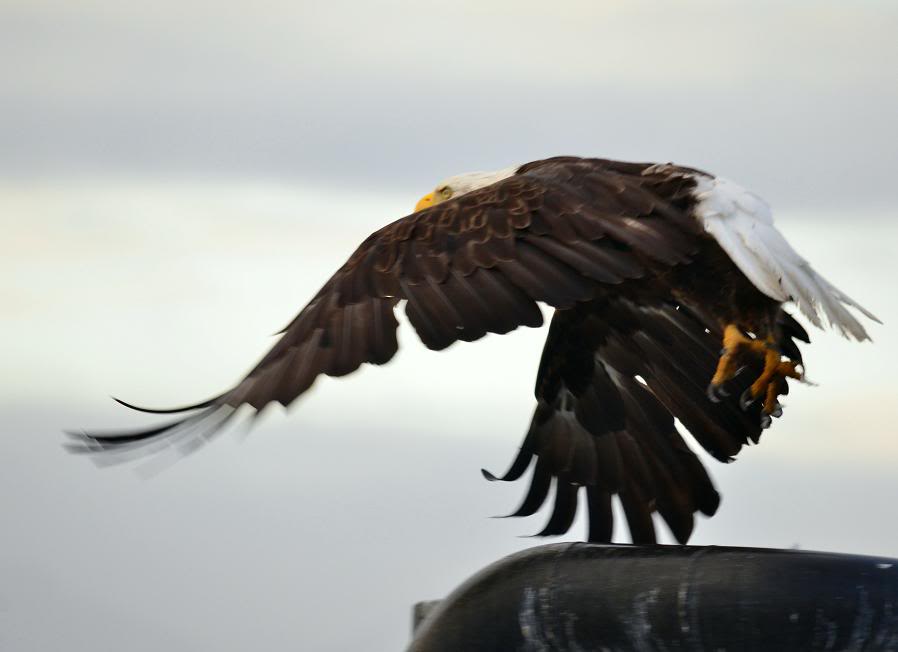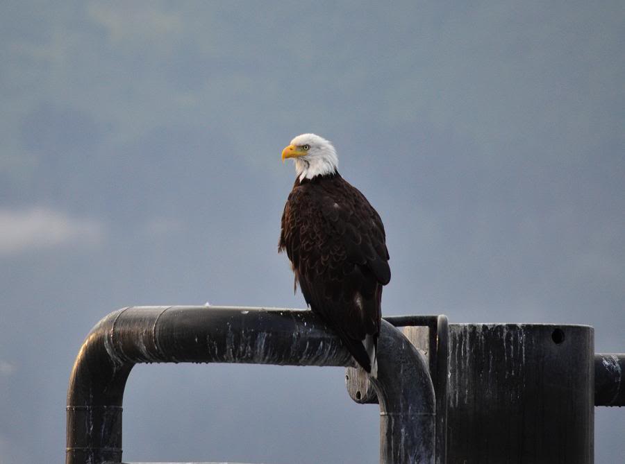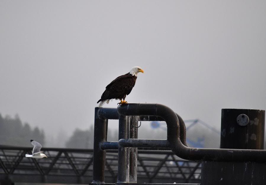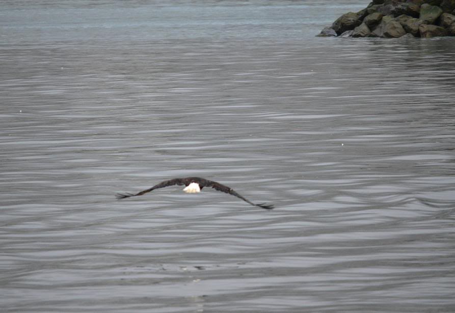 В порту нас поджидала пара Bald Eagles. Они повидимому были сыты и не торопились улетать, благосклонно позволив всем желающим снимать себя во всех ракурсах. Потом мы им надоели; сверкнув жёлтыми когтистыми лапами, орлы взмыли в воздух и, распластавшись над водой, ушли в сторону вечереющего города...