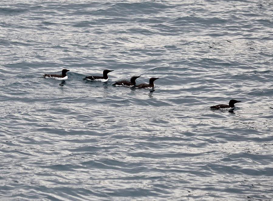 На следующем снимке – семейство птиц, которых у нас называют Common Murre (понятия не имею, как их кличут по-русски, кто знает, напишите, пожалуйста). Эти ребята – превосходные ныряльщики. Они ныряют глубже всех других птиц, всё ещё сохраняющих способность летать, и ухитрялись попадаться в краболовки, поставленные на глубине 640 футов (195 метров). Мюрры не строят гнёзд, откладывая яйца в выемки и трещины голых скал. Оба родителя ответственны за кормёжку своих цыплят отборной селёдкой или, за неимением оной, другой мелкой рыбой.