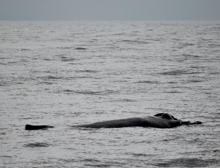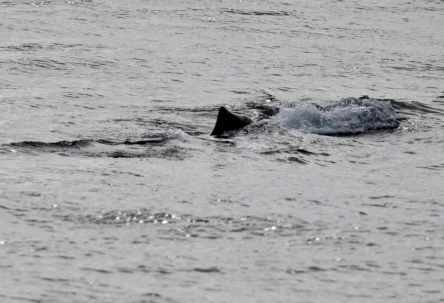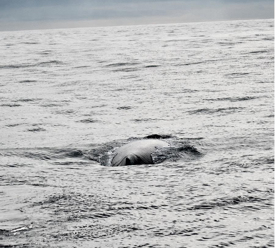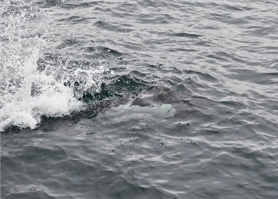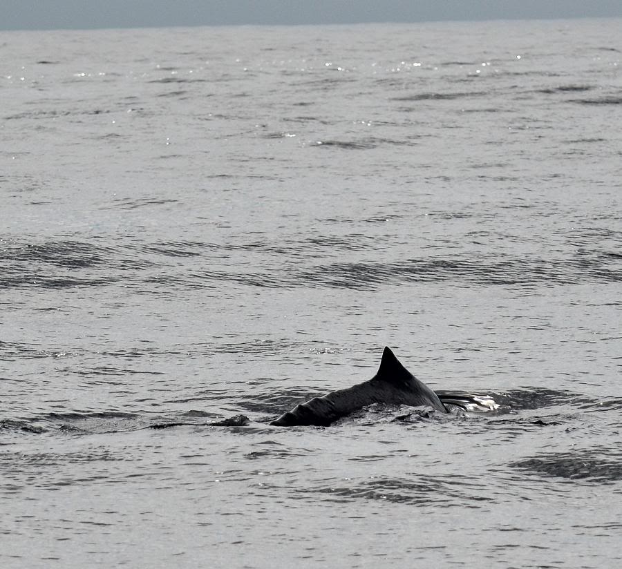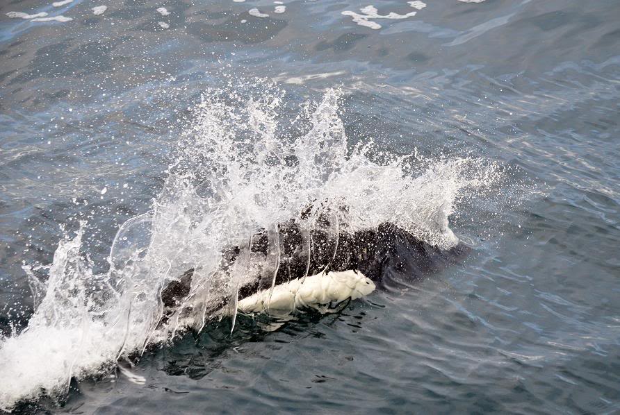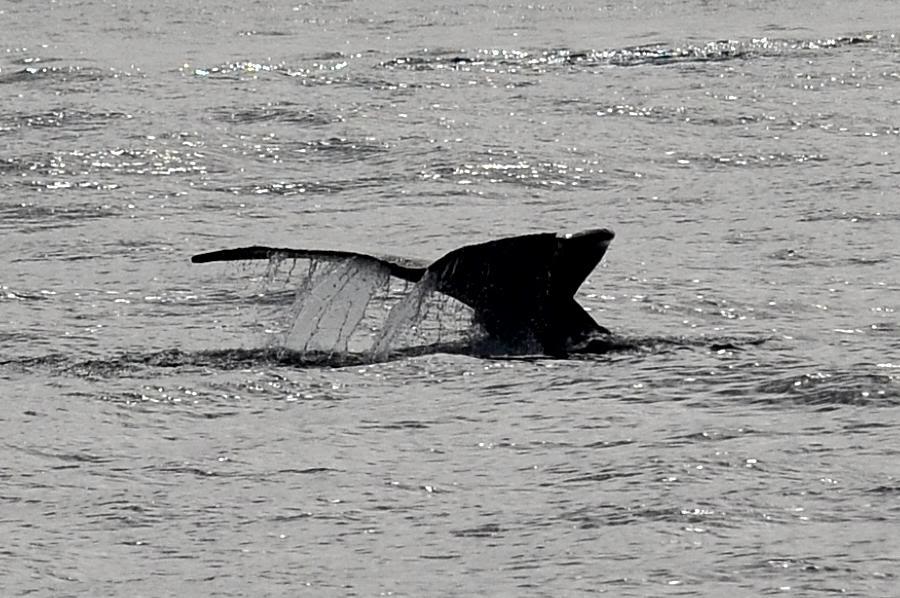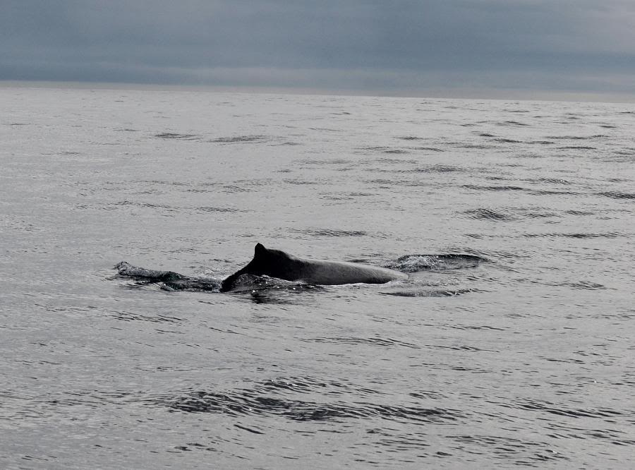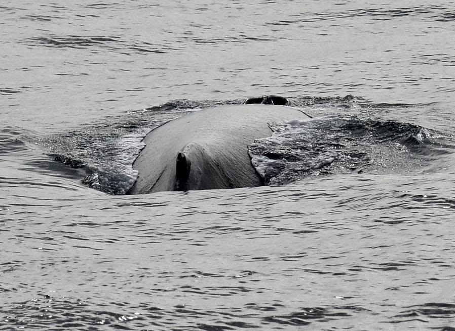 Вскоре после белобоких дельфинов в удалении над водой показался фонтанчик пара, затем поднялась крутая спина с плавником, потом хвост. К сожалению, этот Gray Whale был слишком далеко от нас: крутая волна и качка не позволяли даже с помощью телеобъектива получить качественное резкое изображение