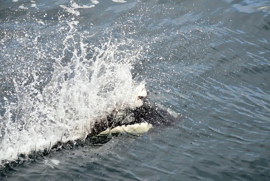 Первыми по дороге на фиорды нам попались дельфины. Живущие в этих местах дельфины отличаются от своих серых атлантических собратьев: Pacific White Sided Dolphins - «белобокие» дельфины - водятся главным образом в холодной северной части Тихого Океана, хотя их наблюдали и в южных водах, вплоть до Японии и Baja California. Они появляются сразу большими группами и все вместе начинают акробатическое представление, выпрыгивая из воды с разных сторон и во всех направлениях перед носом катера, обгоняя его и явно получая удовольствие от этих игр. Сперва я пытался поймать в объектив отдельного дельфина, но быстро понял, что эта задача неосуществима: животные слишком быстры и непредсказуемы . Тогда я включил «пулемёт» – Nikon D7000 позволяет снимать в режиме 6 кадров в секунду – направил аппарат прямо перед носом катера и стал ждать, когда кто-нибудь из артистов вовремя появится на просцениуме. Вот что из этого получилось: