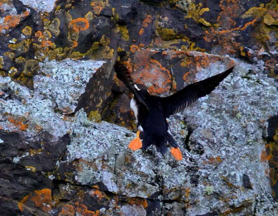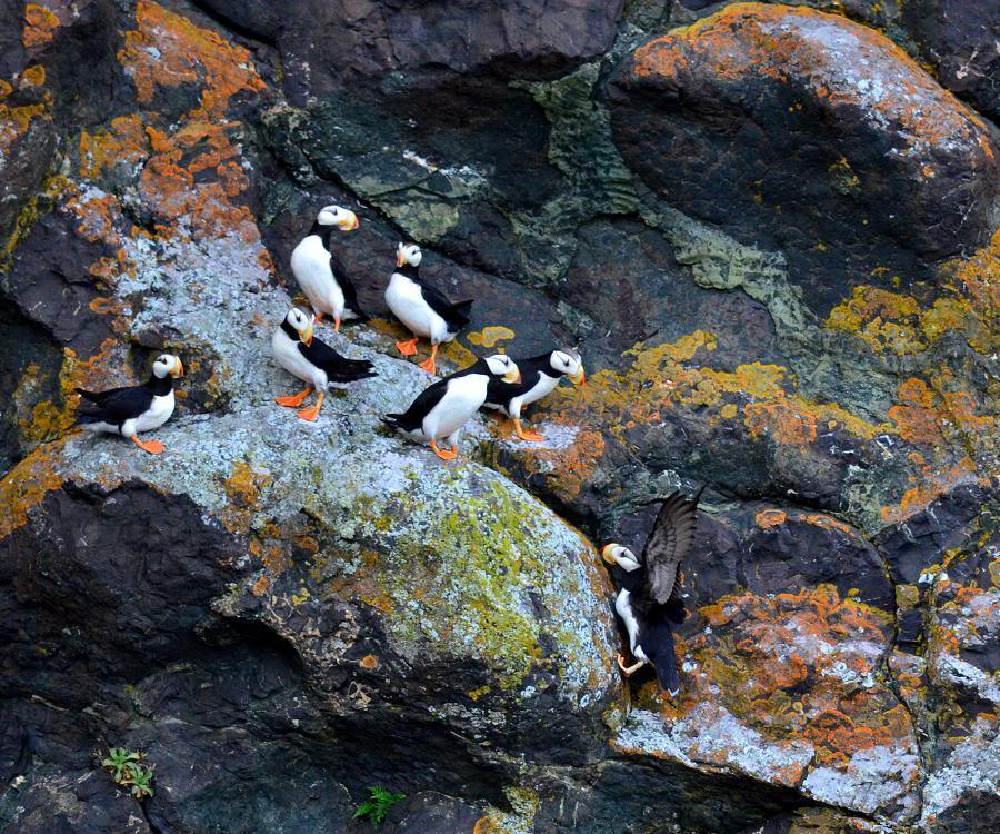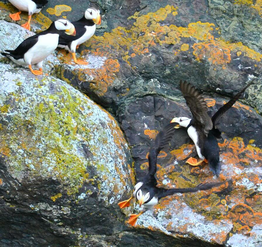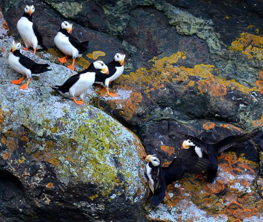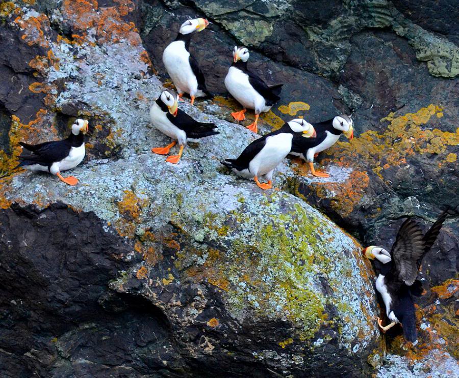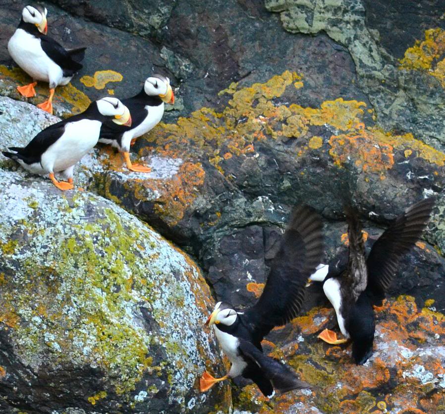 Мне удалось снять интересную сценку с группой носатых паффинов, с удобством расположившихс я на призовом месте скалы: