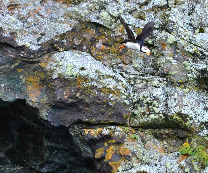 Посторонний, не имеющий отношения к группе, паффин летит, явно намериваясь пристроиться к избранным сородичам: