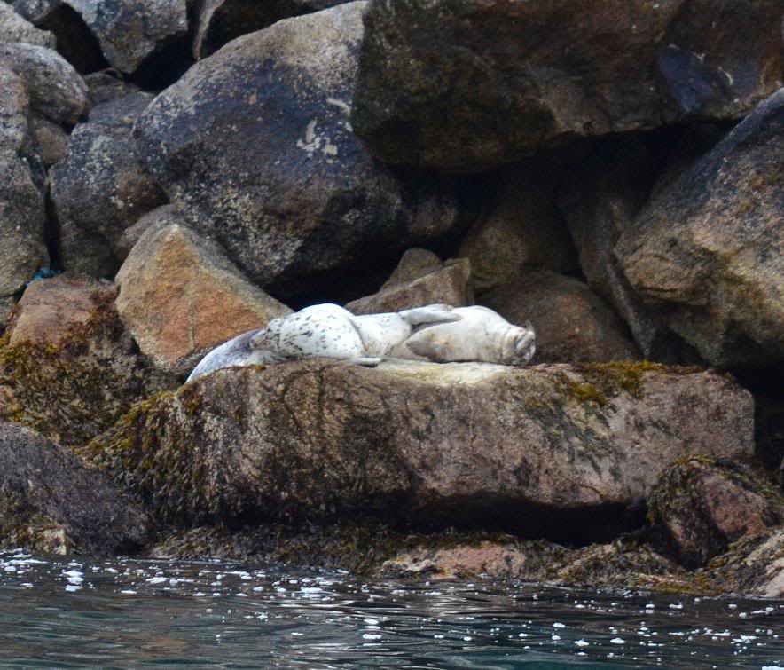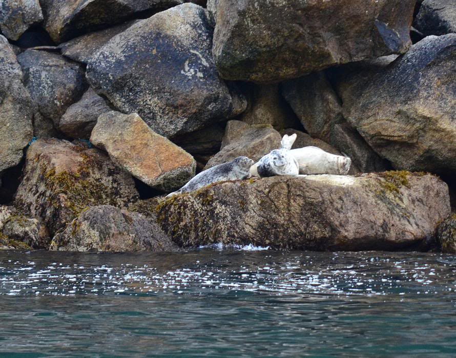 Рыжие Harbor Seals выбирают место для отдыха высоко на прибрежных скалах. Каждый старается занять местечко получше под скудным арктическим солнцем