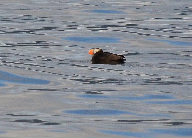Близким родичем Tufted Puffin является Horned Puffin. Эти белогрудые птички не менее красивы: у них крупный горбатый жёлтый клюв с красным кончиком, две характерные чёрные линии у глаз и, в отличие от tufted puffin’ов, лапки у них красные, а не жёлтые. В воде носатый паффин пользуется лапами как рулём, а крыльями гребёт, как вёслами. Алеуты использовали клювы этих птиц в качестве ритуальных украшений.