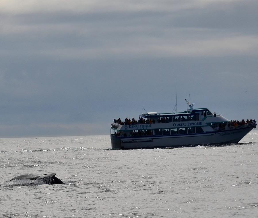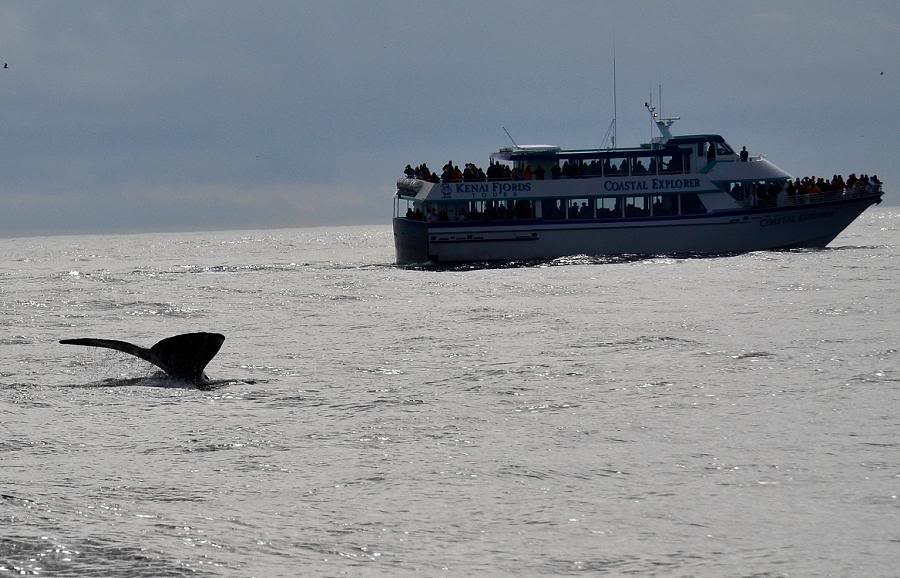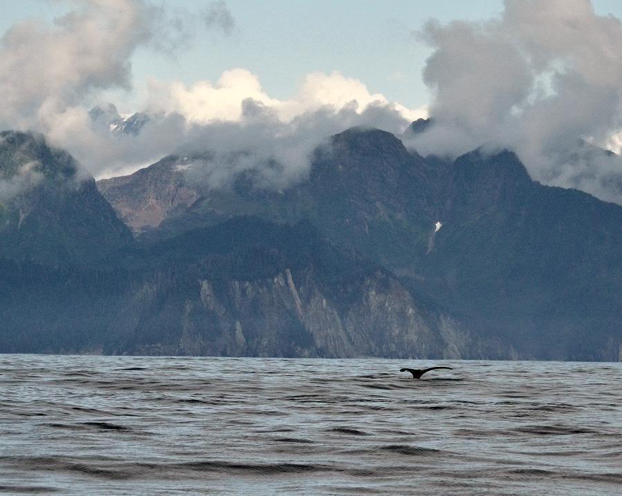 Во время возвращения из фиордов в Сюард нам наконец повезло: два кита всплыли на поверхность между нашим катером и другим прогулочным судёнышком. Мне пришлось фотографироват ь против солнца, зато киты были ну совсем рядом. Вот что из этого получилось: