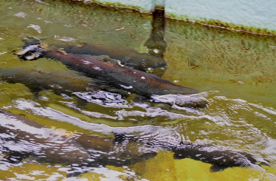 Из этих баков взрослеющая рыба пытается выпрыгнуть, против резкой струи воды, в бассейны для двухлеток. Тем, кому это удаётся, можно поплавать в сравнительном «малорыбье» перед тем, как их выпустят в океан...