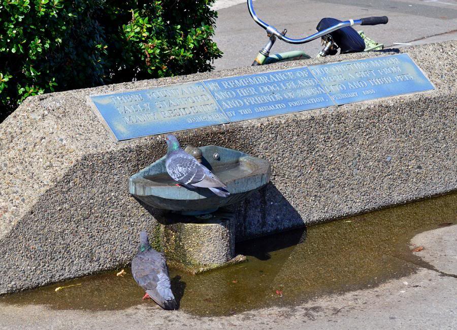 Фонтанчик для собак и птиц под мемориальной доской, поставленной благодарными жителями города покойному мэру Салли Стэнфорд и её собаке Леланд