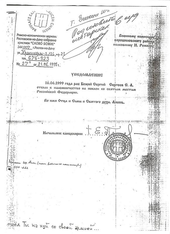 На строгом римско-католическом бланке благообразной кириллицей в адрес райвоенкома полковника Рожкова святой отец Платонов набил на компьютере "уведомление", коим ставил в известность старшего офицера о том, что-де "раб Божий Сергий... отбыл в паломничество на поклон ко святым местам Российской Федерации". И подпись: "начальник канцелярии ростовского cобрания христиан "Слово Божие" Римско-католической церкви каноник Платонов". Внизу, как положено, шло благочестивое "Во имя Отца и Сына и Святого духа. Аминь". Подпись, штамп "Слова Божия".